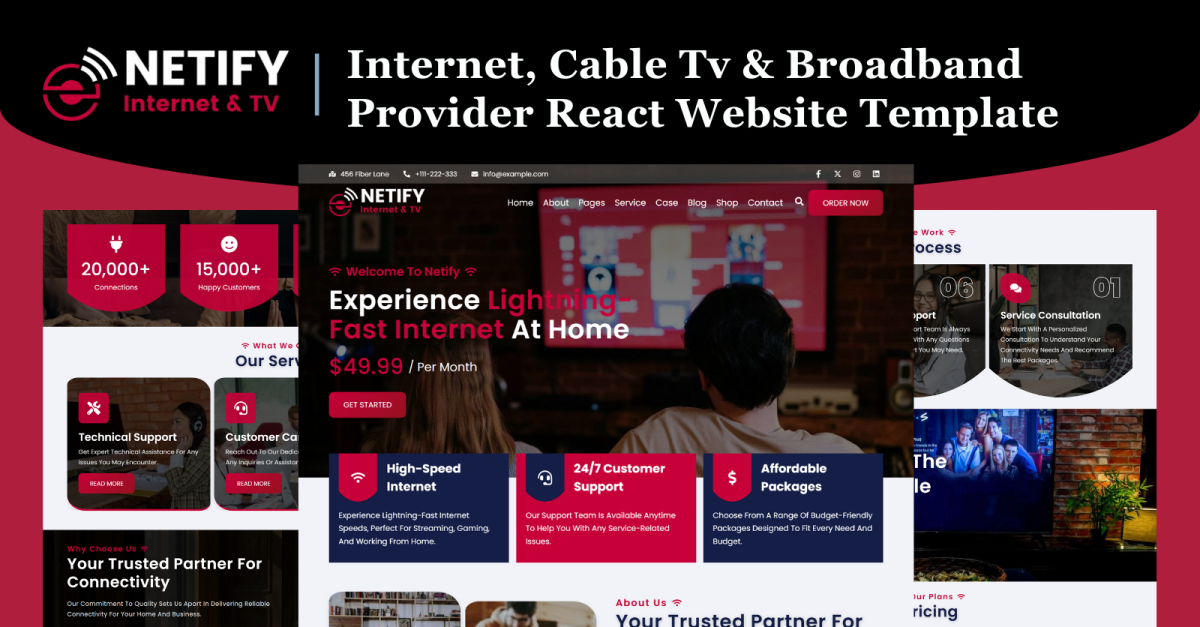 Netify — це професійно розроблений шаблон React, спеціально розроблений для інтернет-провайдерів, операторів кабельного телебачення та компаній, що надають рішення для широкосмугового доступу. Створений за допомогою React.js, сучасного JavaScript та адаптивного CSS3, він забезпечує блискавичну швидкість роботи, плавну навігацію та захопливий досвід на всіх пристроях. Netify пропонує ідеальну цифрову основу для презентації високошвидкісних інтернет-пакетів, виділення відгуків клієнтів та оптимізації запитів на послуги без зусиль. Завдяки своєму елегантному, сучасному дизайну та функціям, орієнтованим на конверсію, Netify дозволяє провайдерам взаємодіяти з користувачами, створювати довіру та підкреслювати надійність, швидкість та передові можливості підключення як для домівок, так і для бізнесу.