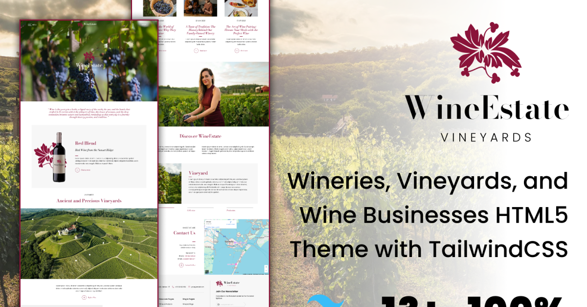 Ідеально підходить для тих, хто шукає елегантний, професійний вебсайт з першокласною продуктивністю , WineEstate створений за допомогою Tailwind CSS – фреймворку, який забезпечує плавну графіку та швидке завантаження.