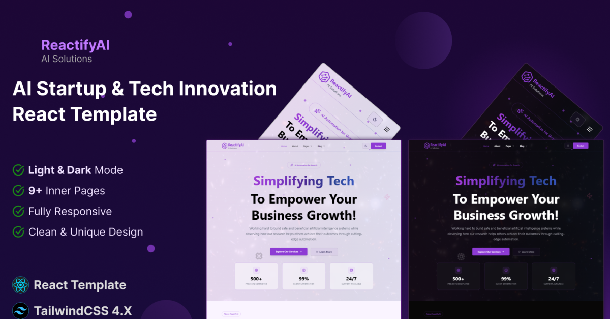 ReactifyAI — це чистий, сучасний та високопродуктивний шаблон React, створений спеціально для стартапів у сфері штучного інтелекту, технологічних компаній, сервісів машинного навчання та інноваційних бізнесів. Розроблений за допомогою React 19, TypeScript, Tailwind CSS v4 та Vite, цей шаблон пропонує футуристичний дизайн, компоненти для багаторазового використання та швидку збірку.