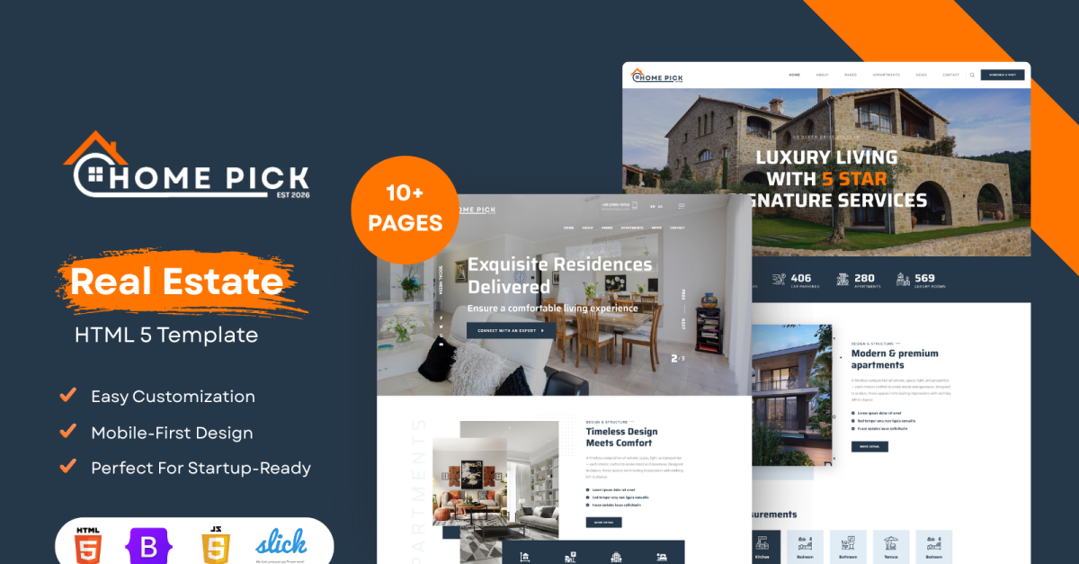 Розроблений за допомогою Bootstrap 5, шаблон забезпечує швидке завантаження, інтуїтивно зрозумілий макет та бездоганне відображення на екранах усіх розмірів. Незалежно від того, чи ви демонструєте житлові оголошення, елітні квартири чи комерційні приміщення, HomePick надає вам усе необхідне для привабливої презентації нерухомості та перетворення відвідувачів на запити.