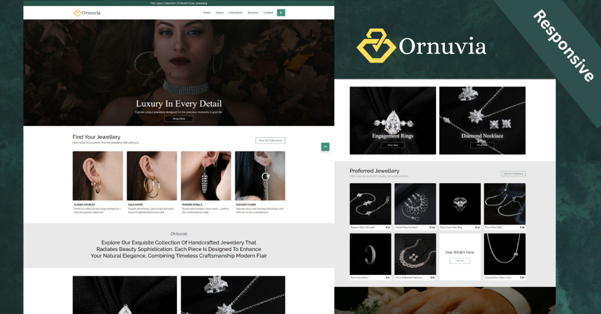 Ornuvia поєднує розкішну естетику із сучасним веб-ефективним дизайном, допомагаючи брендам створити сильну та незабутню онлайн-присутність. Багатосторінкова структура дозволяє компаніям чітко та елегантно доносити свою історію, майстерність та колекції. Незалежно від того, чи запускаєте ви новий бренд ювелірних виробів, чи оновлюєте існуючий веб-сайт, Ornuvia забезпечує вишукану та професійну основу, яка покращує вашу цифрову ідентичність.