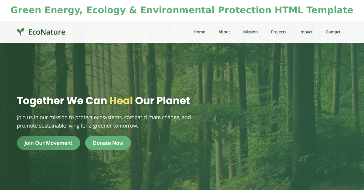 EcoNature — це сучасний, чистий та повністю адаптивний HTML-шаблон з питань довкілля та екології, розроблений для екологічних неурядових організацій, груп боротьби зі зміною клімату, ініціатив сталого розвитку, проектів зеленої енергетики та некомерційних організацій.