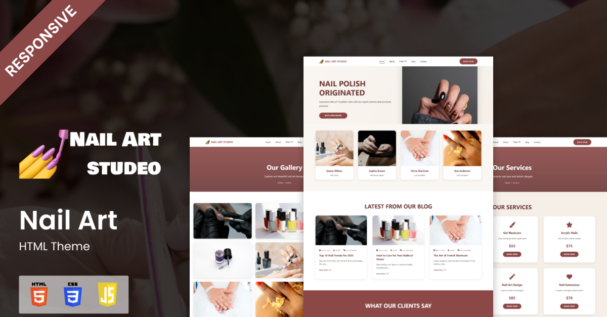 HTML-тема для салонів нейл-арту ідеально підходить для нейл-барів, салонів краси, студій манікюру, центрів педикюру, салонів весільного макіяжу та персональних косметичних брендів, які шукають професійний та модний веб-сайт.