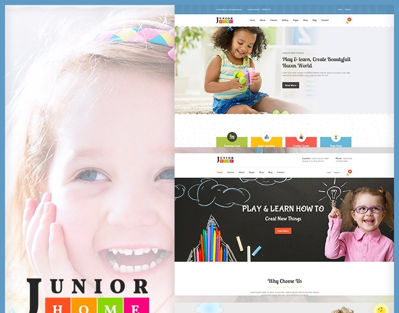 Home Junior — адаптивний шаблон веб-сайту Bootstrap 4 із красивим і унікальним дизайном. Цей шаблон HTML5 підходить для дитячих навчальних закладів, шкіл, курсів, семінарів, електронного навчання, уроків і навчальних веб-сайтів. Кому потрібен досконалий веб-сайт для ігрових шкіл або дошкільних закладів, дитячих установ, дитячих садочків, Home Junior — найкраще рішення для них.