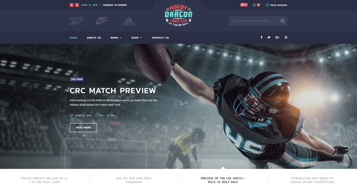 Reebok - Шаблон веб-сайту для багатосторінкового регбі HTML5