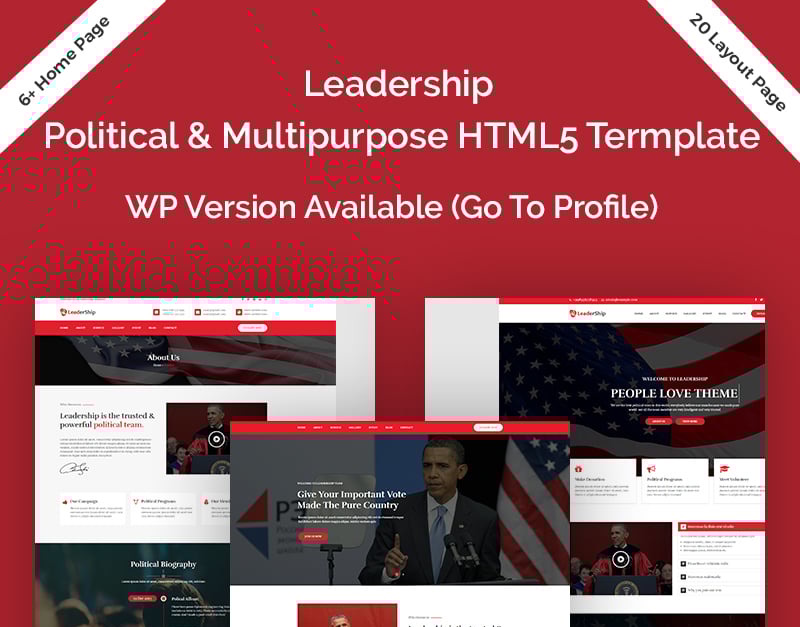 «Лідерство» – це адаптивний політичний шаблон HTML5. Шаблон найкраще підходить для таких тем: політик, законодавець, демократія, політична партія, політична кампанія, політична організація, подія, юрист, збір коштів, уряд, супер PAC, політика, кандидат, кампанія, демократія, уряд, політична партія, політичний лідер, вибори, політик, публічний та мотиваційний оратор, республіканець, пожертвування, юрист, благодійність, активіст, демократ, збір коштів. Шаблон має сучасний дизайн та чистий код. Це 100% адаптивний шаблон для будь-якого браузера.