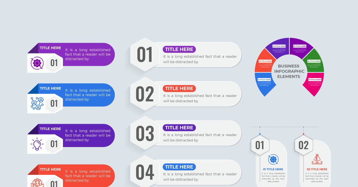 Бізнес інфографіки та діаграма діаграми. Творчий офіс інфографіки та кругової діаграми дизайн колекції з етапами робочого процесу. Елементи сучасної бізнес-презентації та векторна діаграма. Абстрактні дані візуалізації інфографіки встановити вектор.