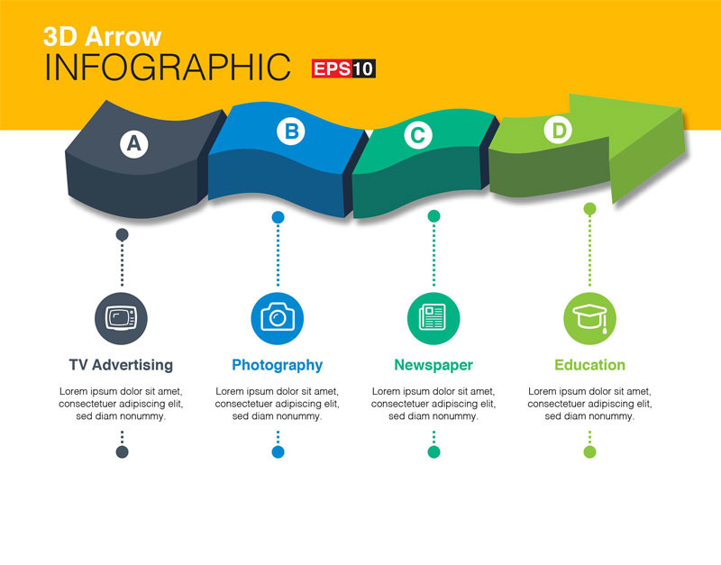 Якщо вам потрібно створити інфографіку й водночас заощадити час і кошти, ця 3D векторна інфографіка зі стрілками стане найкращим варіантом для вас :) Цей набір може зробити вашу інфографіку барвистою, стильною та персоналізованою. Ви можете використовувати ці елементи у своїх проектах, презентаціях PowerPoint, брошурах, статтях, бізнес-звітах, портфоліо, оголошеннях, електронних листах тощо, щоб бути яскравими та інформативними!
