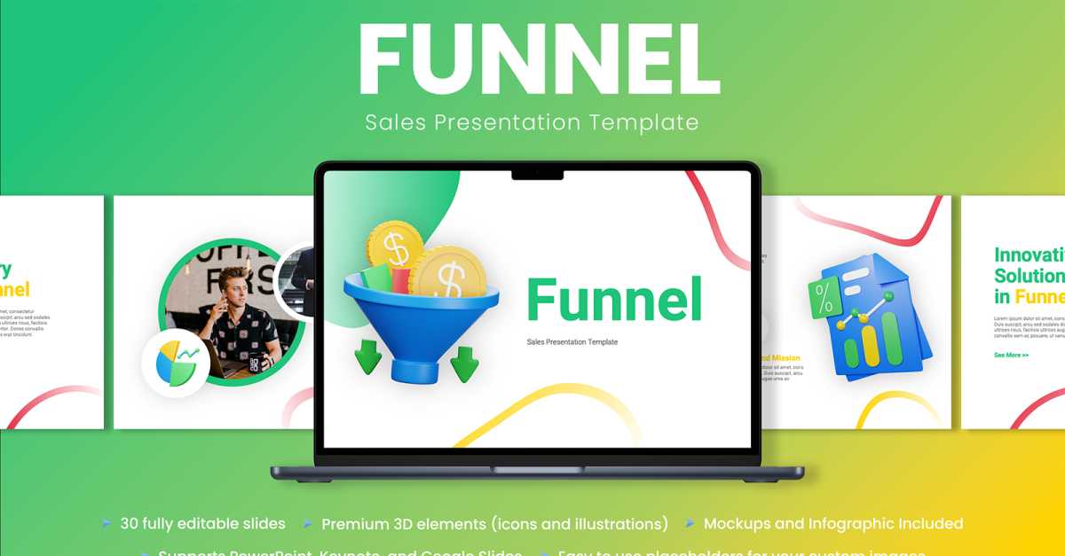 Шаблон презентації Funnel для Apple Keynote — це сучасна та елегантна професійна презентація, яка стане поштовхом до ваших ділових зустрічей і лекцій. Він містить 30 красиво оформлених слайдів, які можна легко редагувати та налаштовувати відповідно до ваших професійних і ділових потреб. На слайдах також представлені наші ексклюзивні 3D-іконки, що стосуються спеціальної ніші.