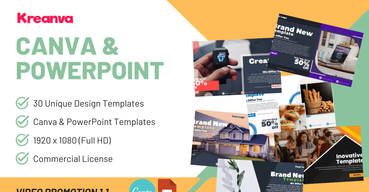 Представляємо наш найкращий набір шаблонів для відеореклами — революційну колекцію з 30 професійно розроблених шаблонів, повністю сумісних з Canva (безкоштовна версія!) та PowerPoint.