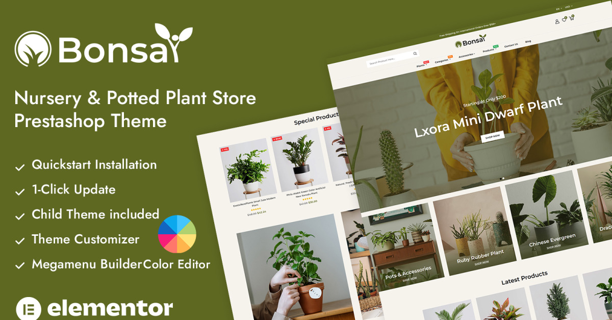Створений за допомогою інтуїтивно зрозумілого конструктора сторінок Elementor , Bonsai дозволяє вам легко налаштовувати свій магазин за допомогою простого інтерфейсу перетягування — жодних навичок програмування не потрібно. Інтегрований налаштовувач тем надає вам повний контроль над кольорами, шрифтами, банерами та стилями макета в режимі реального часу, що дозволяє вам формувати свій магазин відповідно до природної ідентичності вашого бренду. Гнучкий конструктор мегаменю допомагає впорядкувати категорії рослин, типи догляду, сезонні колекції та аксесуари в простій та зручній структурі навігації.