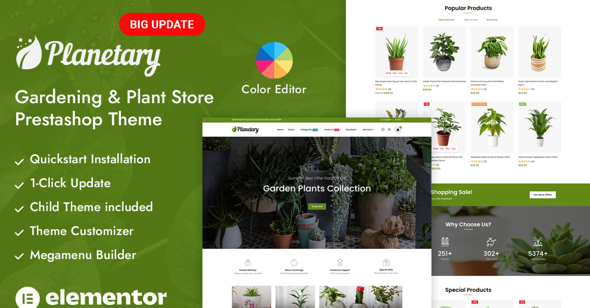 Planetary – адаптивна тема PrestaShop для магазинів рослин та розсадників – це свіжа, натхненна природою та чудово розроблена тема електронної комерції, розроблена для розсадників рослин, садівничих магазинів, продавців кімнатних рослин, квіткових бутиків, магазинів товарів для ландшафтного дизайну та екологічно чистих брендів. Завдяки спокійній кольоровій палітрі, м’якій типографіці та просторому макету, Planetary забезпечує заспокійливий та органічний досвід покупок, який ідеально доповнює рослинні продукти.