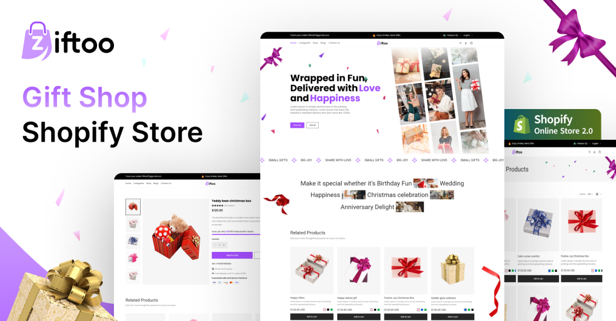 Незалежно від того, чи продаєте ви персоналізовані подарунки, вітальні листівки, квіти, аксесуари, декор для дому чи святкові подарункові кошики, Ziftoo пропонує ідеальне поєднання естетики та продуктивності. Його інтуїтивно зрозуміла система дизайну з функцією перетягування, гнучкі розділи та бездоганний користувацький інтерфейс дозволяють легко налаштувати кожен куточок вашого інтернет-магазину без жодного рядка коду.