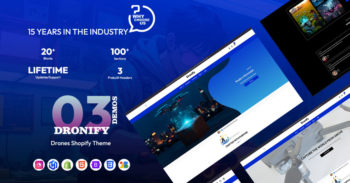 Dronify створено з використанням фреймворку тем на базі штучного інтелекту , що забезпечує оптимізовані макети, швидке завантаження та безперешкодне налаштування. Кожен розділ і компонент створені з урахуванням реальних потреб електронної комерції — від розповіді історій продукту до конверсії при оформленні замовлення.