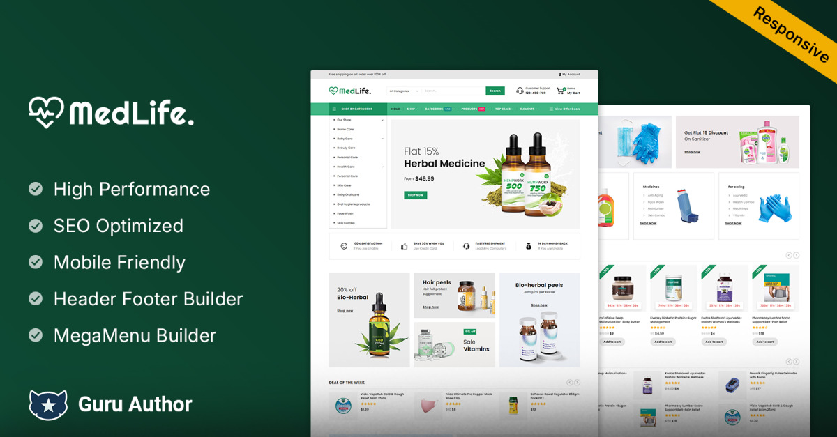Medlife - магазин WooCommerce, що адаптується до медицини та ліків. Medlife дозволяє створити високопрофесійний інтернет-магазин. Шаблон Medlife було розроблено, щоб виділити спеціальні продукти, які допомагають збільшити ваші продажі та є ідеальними пікселями, гарантуючи, що ваш кінцевий продукт є більш гнучким і розширюваним. Особливо з новим пакетом демо-імпорту 1-Click вам знадобиться всього кілька хвилин, щоб ваш сайт був таким же, як наші демонстраційні версії. Medlife має гарний, чистий і сучасний вигляд з унікальними корисними функціями.
