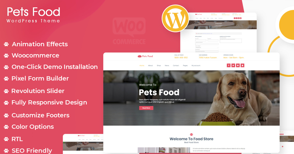 Ця тема WordPress Petsfood — Pets Food Store — це охайний і милий магазин їжі для ваших пухнастих і милих домашніх тварин. Його можна багатоцільово використовувати для догляду за домашніми тваринами, а також на ринку кормів для котів, собак та інших кормів для тварин.