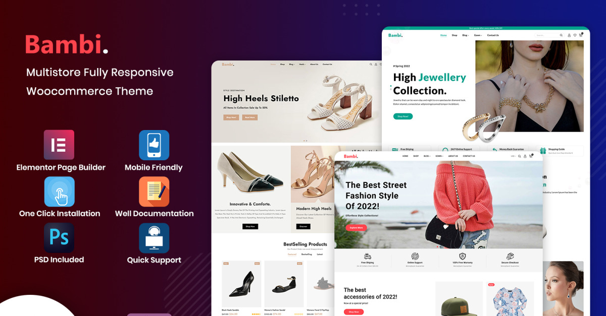 Bambi – багатоцільовий (мода, ювелірні вироби та взуття) адаптивний шаблон WooCommerce. Отримайте тему Bambi з усіма макетами за єдиною ціною та багатьма варіантами, щоб стати власником веб-сайту. Bambi поставляється з різними конструкціями різного призначення з qr-сканером. Конструктор сторінок Elementor із функцією перетягування, вибір кількох кольорів, вибір сімейства шрифтів, варіації продукту, фільтр Ajax, мегаменю, мета-слайдер, готовий до електронної комерції, повністю чуйний, сумісний із усіма основними браузерами, YITH, чудовий шрифт, легко налаштувати, Вибір шрифтів Google, масштабування продукту, інтеграція порівняння та списку побажань, додавання Ajax у кошик, карусель продуктів, фільтрація продуктів, розширений швидкий перегляд, розширений дизайн продукту, сучасний дизайн, слайдер виробника/бренду, адаптивний слайдер, інтеграція кількох валют, перегляд сітки, контактна форма 7, система підтримки запитів, швидка цілодобова підтримка, добре HTML-документація, кожен розділ повністю оптимізований для мобільних пристроїв, оптимізований для SEO, вміст cms, відгуки клієнтів, продукти для категорії, включений файл PSD/XD.