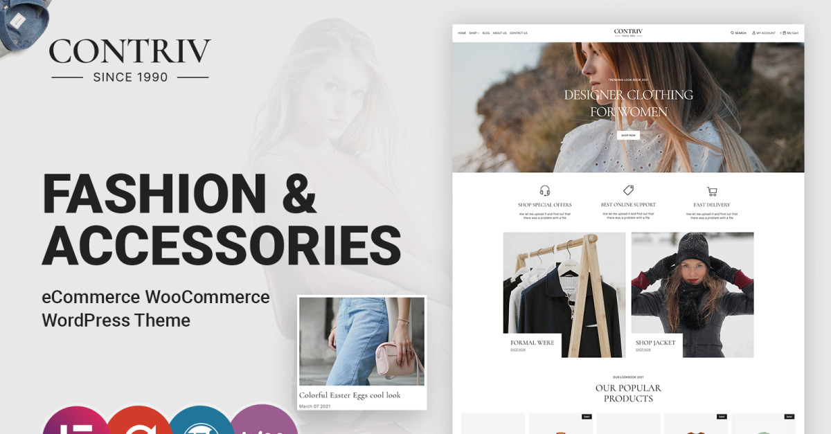 Contriv – інноваційна тема для модного магазину. Ця тема WooCommerce є чудовим вибором для онлайн-бутіків одягу, брендів одягу та інших онлайн-магазинів одягу. Завдяки своєму елегантному та сучасному веб-дизайну Contriv може впоратися навіть із найвимогливішими специфікаціями для онлайн-магазину, а його бездоганне візуальне зображення відповідає лише вражаючим функціям, які він пропонує всередині. Унікально створений за допомогою зручного редактора сторінок із функцією перетягування. Зокрема, ваші споживачі можуть легко робити покупки з будь-якого пристрою, який їм подобається. Тепер, коли ми все зробили, давайте зосередимося на покращенні вашого магазину електронної комерції за допомогою теми Contriv.