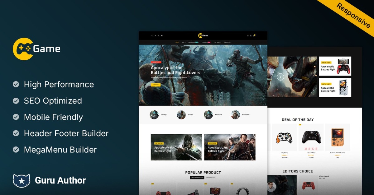 Ми створили Gamestore, елемент онлайн-ігор або тему комерції, яка найкраще підходить для відеоігор, відео, DVD, ігрових контролерів, музики, гаджетів, спорту, фільмів, заходів, розваг та інших продуктів, як-от обладнання, оскільки ми вважаємо, що Веб-сайт ринку відеоігор потребує модернізації. Редагувати кожну підсторінку легко. Зразок даних надається разом із ним, тож ви можете швидко й легко встановити цю тему у своєму бізнесі, щоб вона виглядала точно як наш приклад магазину. Інструкції зі встановлення включені в пакет тем, щоб ви могли налаштувати цю тему у своєму магазині WooCommerce. Ми віримо, що ця тема дозволить вам створити найбільш оригінальний і естетично привабливий ігровий магазин.