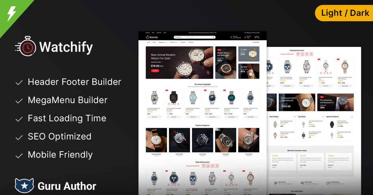 Представляємо Watchify , приголомшливу, високоефективну тему WooCommerce, створену TemplateMela для годинників, ювелірних виробів і магазинів модного одягу . Незалежно від того, чи демонструєте ви розкішні годинники, елегантні ювелірні вироби чи останні тенденції моди, Watchify пропонує елегантний сучасний дизайн із потужною функціональністю електронної комерції — усе це повністю інтегровано з Elementor для легкого налаштування.