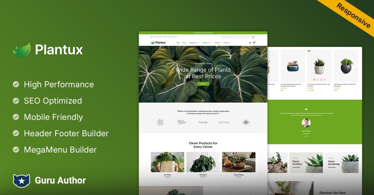 Plantux поставляється з набором функцій, розроблених, щоб допомогти вашому бізнесу процвітати. Від настроюваних макетів домашньої сторінки до галерей продуктів і простих процесів оформлення замовлення, кожна функція створена для покращення взаємодії з користувачем і збільшення конверсій. Крім того, завдяки вбудованій оптимізації SEO ваш веб-сайт матиме вищі позиції в пошукових системах, залучаючи більше органічного трафіку.