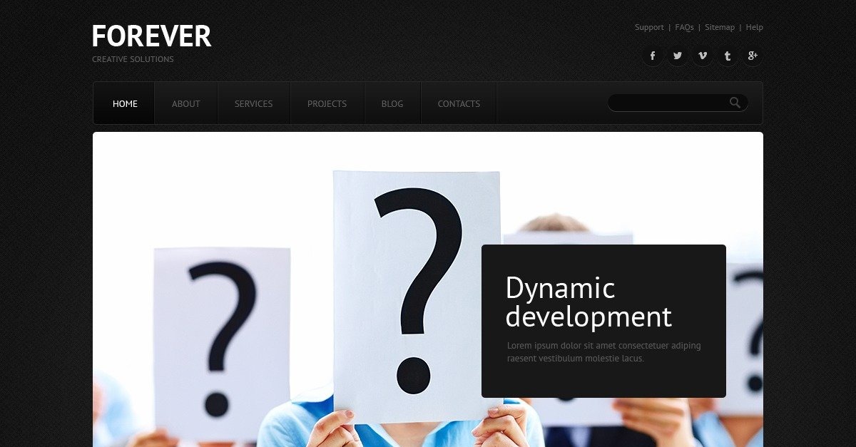 Поєднання чорного і сірого відкриває якусь ділову строгість, тому підходить для залучення клієнтів. У верхній частині шаблону є гарно зроблені кнопки соціальних мереж, які пропонують перевірити, підписатися та поділитися. Область вмісту легко задовольнить інтерес, викликаний ковзаючими зображеннями та гаслами.