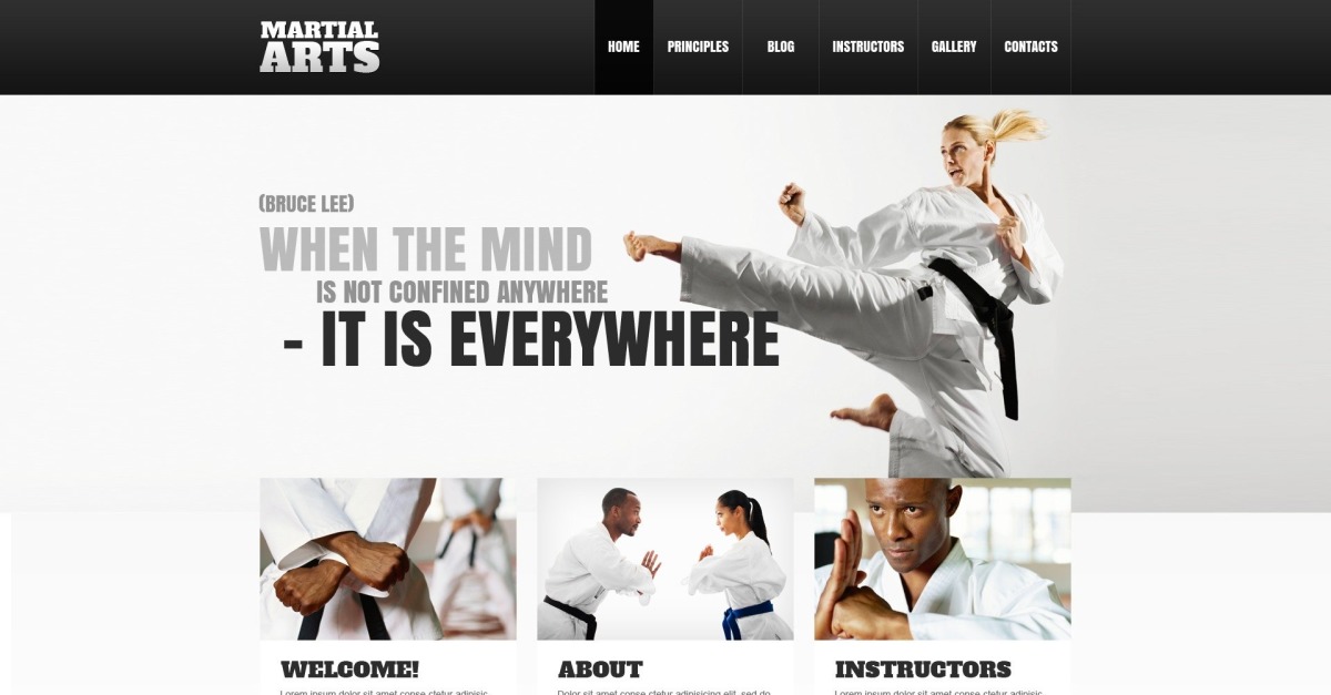 Слайдер чудовий своїми змінними фотографіями високої роздільної здатності, покращеними мудрими цитатами та прислів’ями, що відсилають до стародавньої мудрості філософії бойових мистецтв. Дизайн поглинає чорний і білий кольори, надаючи в результаті елегантність простоти і простоту елегантності. Зручність використання підвищується завдяки кнопці «Назад до верху» та макетам для смартфонів та інших портативних пристроїв.