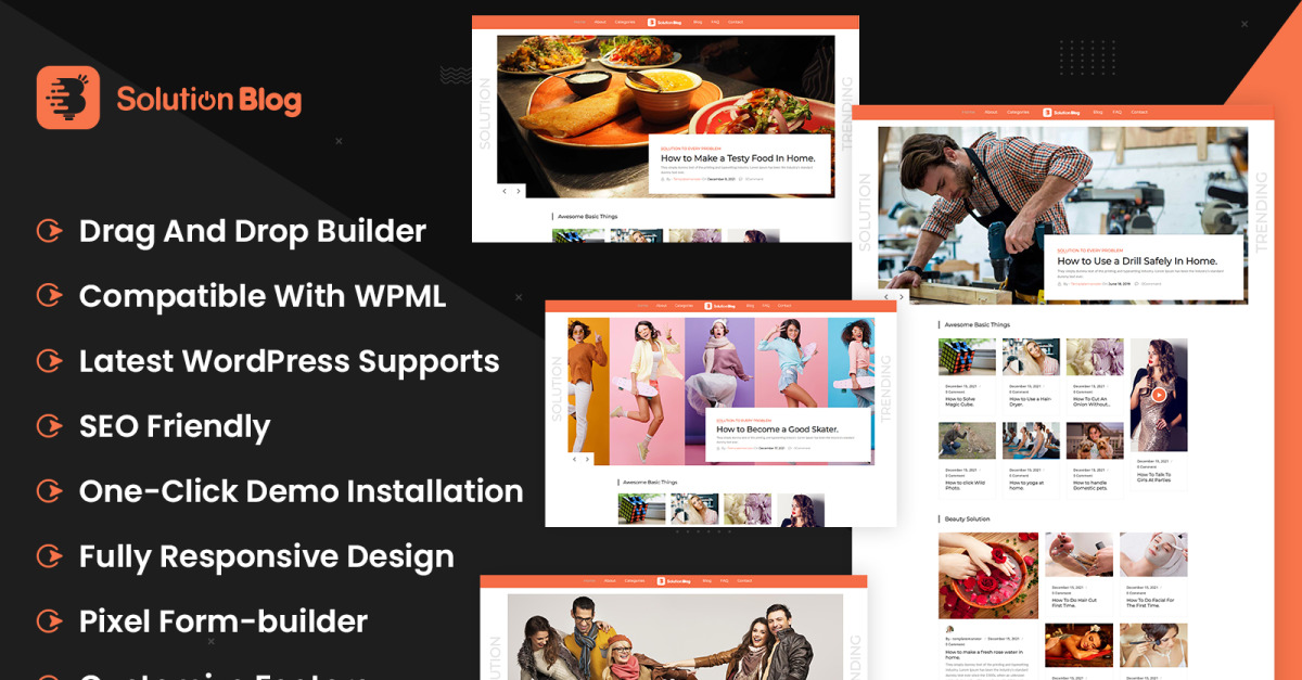 Як випливає з назви, WordPress-тема для блогів рішень тут, щоб надати рішення для запитів або поділитися думками, щоб допомогти іншим дізнатися про тенденції, культури та ідеології на різні теми через ваші блоги. Ця тема блогу має свіжий і чіткий вигляд, завдяки чому відвідувач вартує витраченого часу. Ця унікальна тема для блогів, яку можуть використовувати аматори чи професіонали для блогів про персонал, блогів про моду та спосіб життя, блогів про подорожі, блогів партнерів/оглядів, блогів про їжу, бізнес/корпоративних блогів, мультимедійних блогів, блогів новин, блогів про техніку, блогів про здоров’я та так далі.