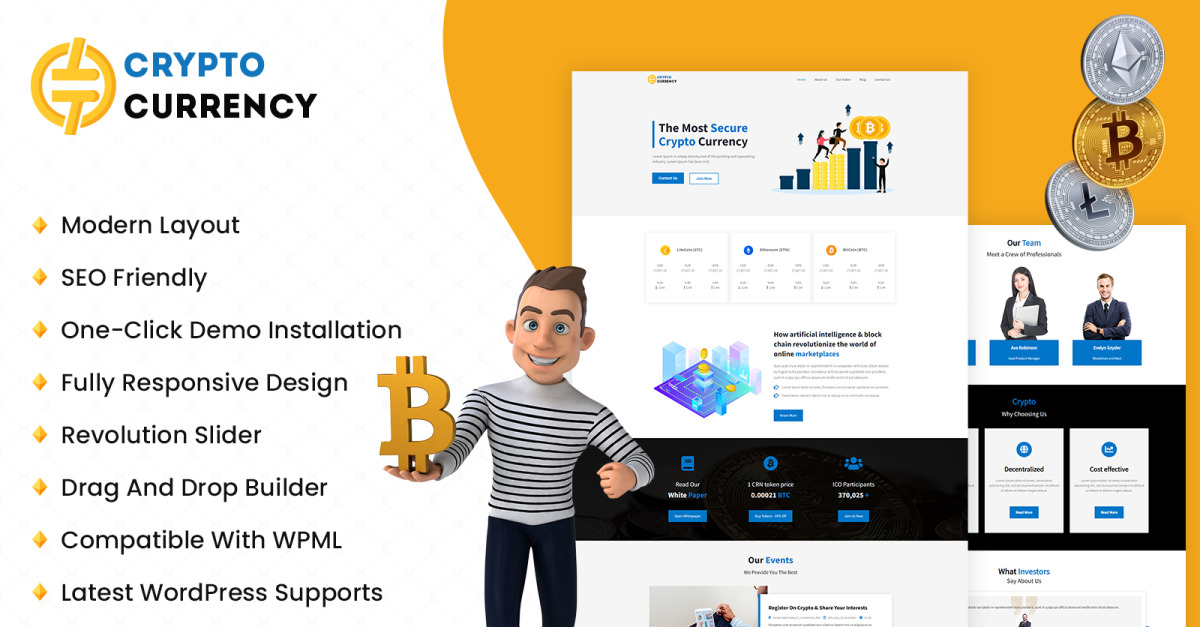 Тема WordPress Cryptocurrency може підійти для веб-сайтів з майнінгу біткойнів, обміну та торгівлі криптовалютами, цифровими валютами, а також для будь-якої іншої особи, яка бажає збільшити рівень адміністрування та представити свої досягнення в Інтернеті. Спробуйте цю вражаючу привабливу тему WordPress Cryptocurrency та забезпечте стабільну презентацію для свого підприємства в Інтернеті.