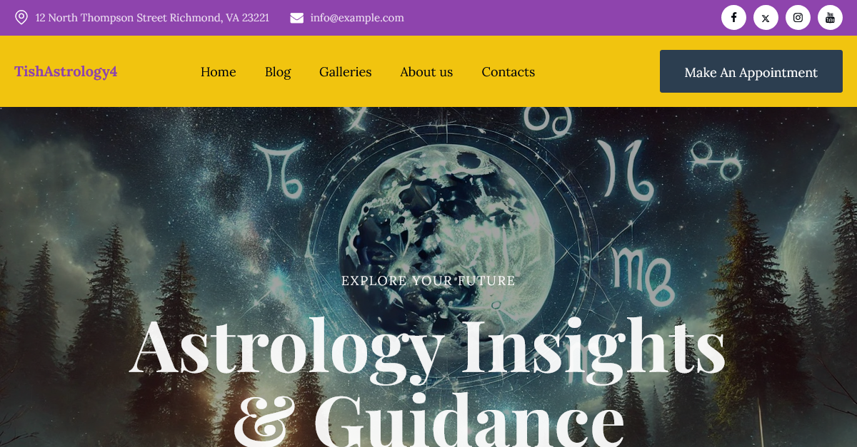 TishAstrology4 поєднує естетичну привабливість із функціональним дизайном. Тема побудована на блоках Гутенберга, що забезпечує неперевершену гнучкість у створенні та налаштуванні вашого веб-сайту. Чистий, сучасний дизайн гарантує, що ваш вміст виділятиметься, а елементи на тему астрології додадуть нотки містики та привабливості. Кольорова схема за замовчуванням, натхненна нічним небом, включає опівнічно-блакитний, зоряний білий, небесне золото, туманно-фіолетовий і місячний сірий, створюючи гармонійний і візуально привабливий фон для вашого вмісту.