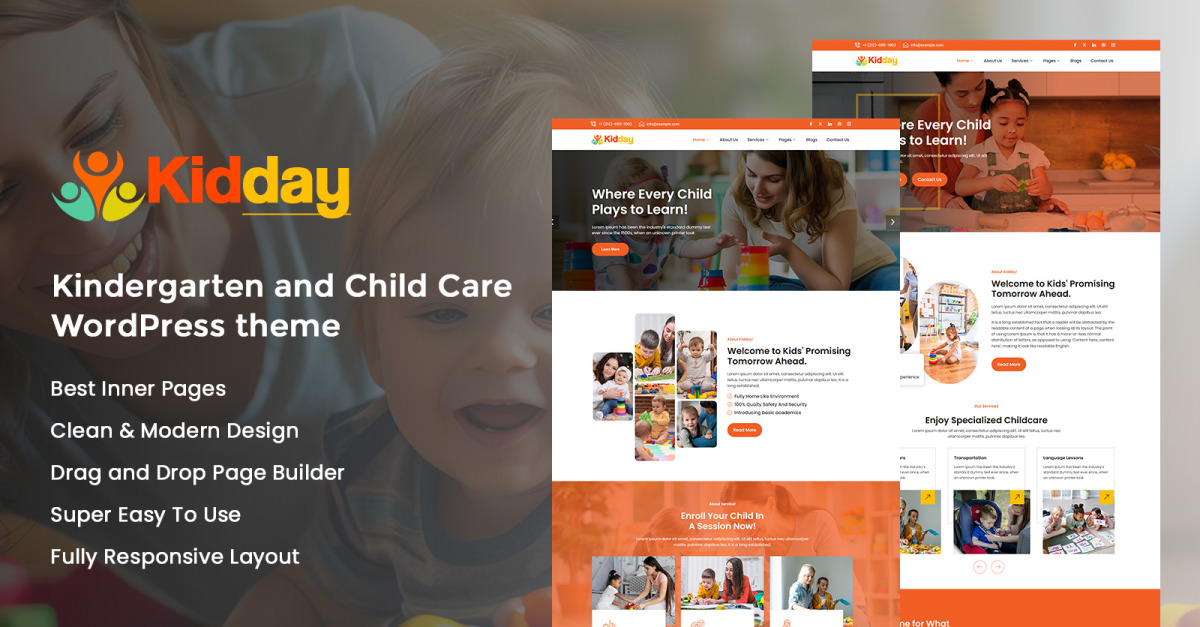 Kidday розроблено з урахуванням унікальних потреб навчальних закладів. Незалежно від того, чи ви керуєте дитячим садком, дитячим садком або центром догляду за дітьми, ця тема надає всі інструменти, необхідні для створення професійного, зручного веб-сайту, який резонує з батьками та демонструє вашу відданість дошкільній освіті.