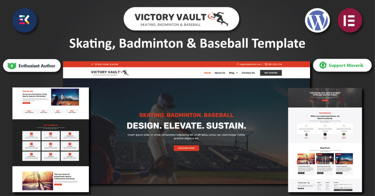 Victory Vault – шаблон WordPress Elemnetor для катання на ковзанах, бадмінтону та бейсболу