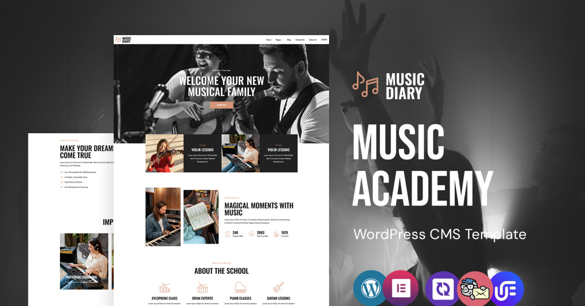 MusicDiary — це стильна та орієнтована на продуктивність тема WordPress, створена виключно для музичних академій, центрів навчання інструментам і закладів виконавського мистецтва. Незалежно від того, чи ви навчаєте класичного фортепіано, сучасної гітари, уроки вокалу чи оркестрових інструментів, ця тема вражає ідеальний акорд між елегантністю та функціональністю.