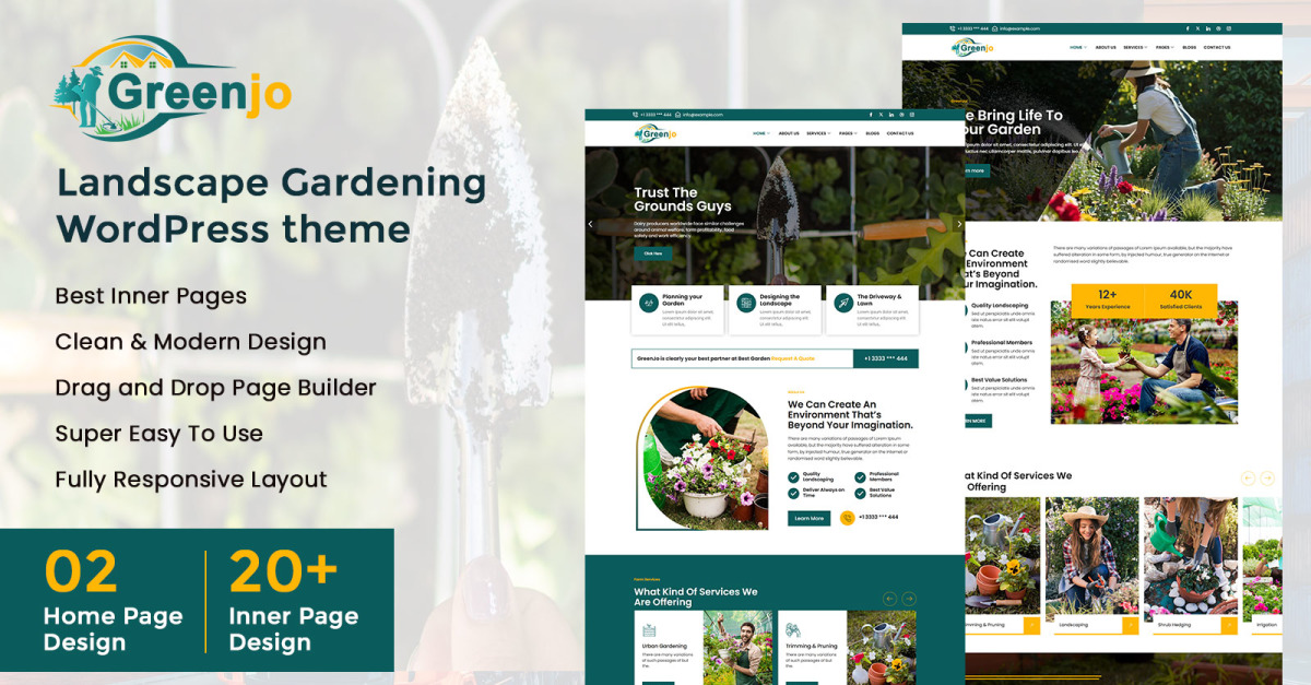 GreenJo – це яскрава тема WordPress, розроблена для ландшафтних дизайнерів, садівників та компаній, що займаються дизайном екстер'єру, які прагнуть створити приголомшливу онлайн-присутність. Ця тема містить спеціальні розділи для демонстрації послуг, галерей проектів, відгуків клієнтів та цін, що допомагає вам легко залучати потенційних клієнтів. Її налаштовувані макети та зручний дизайн роблять створення унікального веб-сайту простим та ефективним. Повністю адаптивна та SEO-оптимізована, GreenJo гарантує, що ваш сайт добре працюватиме на всіх пристроях та охоплюватиме ширшу аудиторію. З GreenJo ви можете розвивати свій бізнес, демонструвати свою експертизу та зв'язуватися з клієнтами, які цінують красиві ландшафти.