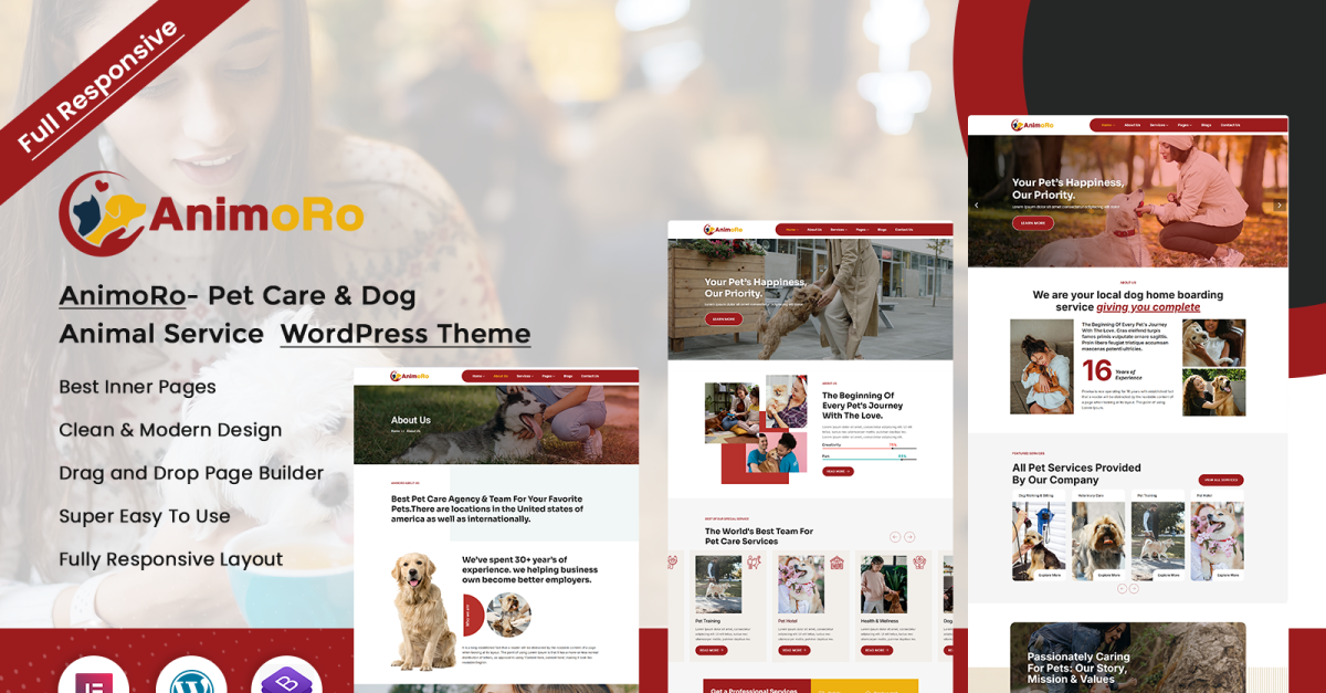 Animoro — це весела та приваблива тема WordPress, розроблена для центрів догляду за тваринами, ветеринарних клінік, грумерів та дресирувальників собак. Її теплий дизайн та грайлива візуальна складова створюють миттєвий емоційний зв'язок з любителями домашніх тварин. Тема містить окремі сторінки для послуг, профілів домашніх тварин, запису на прийом та відгуків клієнтів. Завдяки адаптивному макету та простому налаштуванню перетягуванням елементів, створення веб-сайту вашої мрії стане легким. Animoro також оптимізований для пошукових систем та безперебійно працює на всіх пристроях. Незалежно від того, чи керуєте ви спа-салоном для домашніх тварин чи ветеринарною службою, ця тема допоможе вам продемонструвати співчуття та досвід із шармом та професіоналізмом.