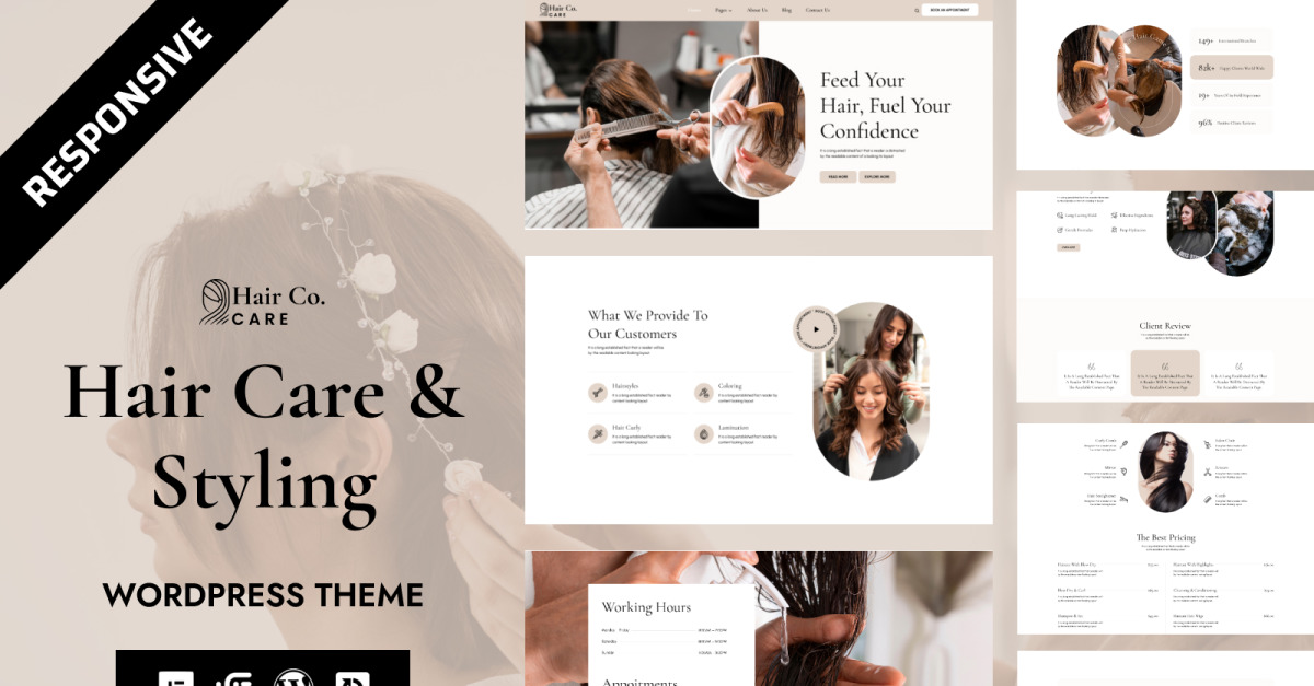 Трансформуйте цифрову присутність вашого салону за допомогою шаблону WordPress для зачісок та стилізації Hair Co. – сучасної, елегантної та оптимізованої для продуктивності теми, створеної ексклюзивно для перукарень, салонів краси, студій краси, стилістів та фахівців з моди. Розроблений з ідеальним балансом стилю та функціональності, цей шаблон допоможе вам залучити більше клієнтів, красиво продемонструвати свої послуги та легко підвищити імідж вашого бренду.