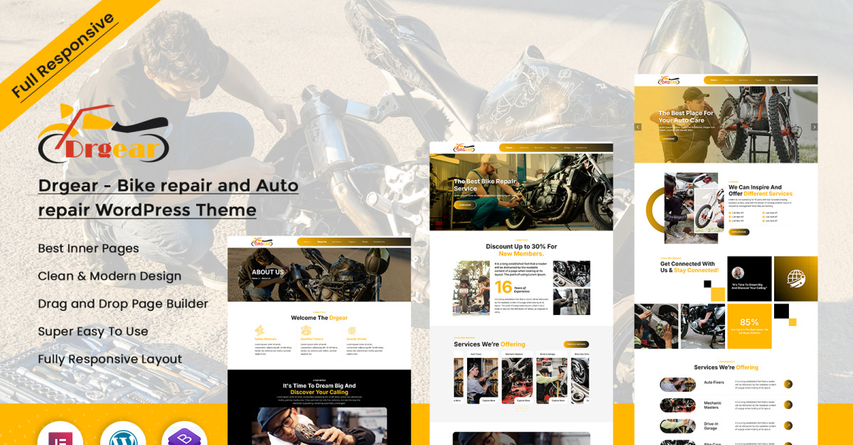 Drgear — це надійна та ефективна тема WordPress, розроблена для веломайстерень, автомобільних майстерень та фахівців з ремонту автомобілів. Вона має чистий макет, натхненний механіками, з розділами для послуг, бронювання, цін та відгуків клієнтів. Drgear повністю адаптивний, SEO-орієнтований та налаштовується за допомогою Elementor, що дозволяє навіть новачкам швидко запускати повнофункціональний веб-сайт. Його дизайн, орієнтований на продуктивність, забезпечує швидке завантаження та сумісність з мобільними пристроями. Незалежно від того, чи ремонтуєте ви мотоцикли, обслуговуєте автомобілі чи продаєте запасні частини, Drgear допоможе вам створити надійну онлайн-присутність, яка стимулюватиме бронювання та зміцнюватиме довіру клієнтів.