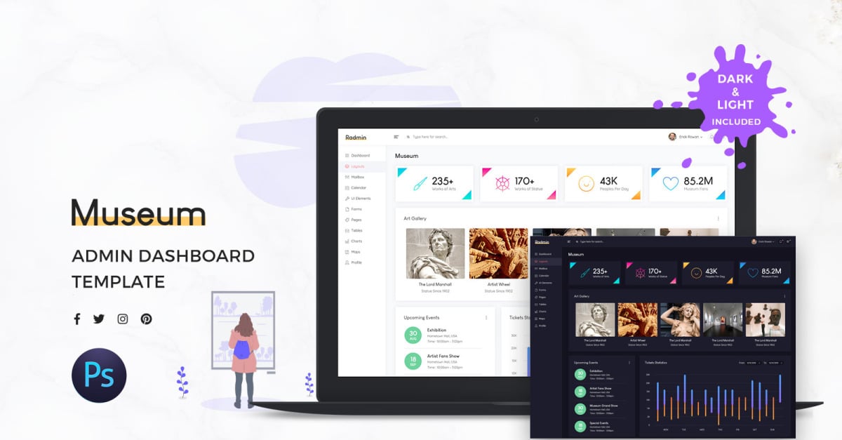 Museum Admin Dashboard UI Kit designed with Photoshop with a modern look. A fully design admin dashboard. It can be used in Museum of web application such as admin panel, project management system, admin dashboard, application backend and so on. Includes light and dark version.