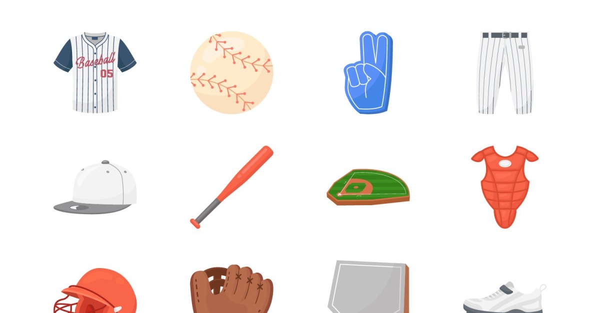 This set contains ball, baseball bat, baseball cap, baseball field, baseball shoe, chest protector, gloves, hand sign, helmet, home plate, jersey, and pants.