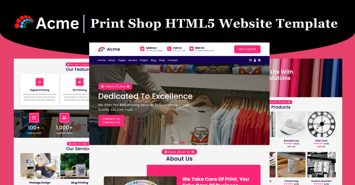 Acme is a bright and elegant Print Shop HTML5 Website Template design. It is best for printing, copying, Business cards, Postcards, Banner, Poster, Flyers, T-Shirt Printing, Mug Printing, Package Design and all other printing related services. It also includes a huge number of awesome features and sections, such as about, features, services, projects, team, testimonials, blogs, products, contact page. Through working contact form present in the contact section, your website visitors can easily reach out to you. This layout is responsive and looks incredible on any mobile phone, tablet, and desktop. It is Cross-browser Compatible and works across various modern browsers and devices.
