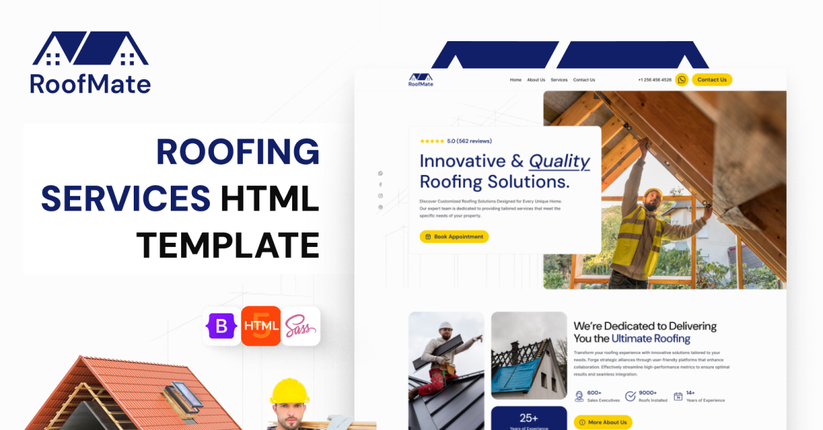 Roofmate is a premium, fully responsive HTML template meticulously designed for roofing companies, construction contractors, home renovation services, and maintenance businesses. Crafted with clean code, modern design principles, and the latest Bootstrap framework, Roofmate empowers roofing professionals to build a stunning online presence with ease.