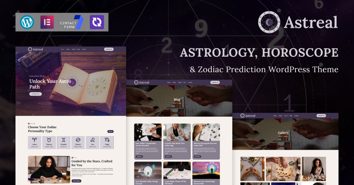 Astreal is a beautifully crafted and intuitive WordPress theme designed for astrologers, horoscope readers, tarot experts, spiritual guides, and zodiac-based content creators. With its mystical design, elegant typography, and star-inspired visuals, Astreal provides a captivating digital space to showcase astrological insights, zodiac personality types, tarot sessions, and cosmic guidance services.
